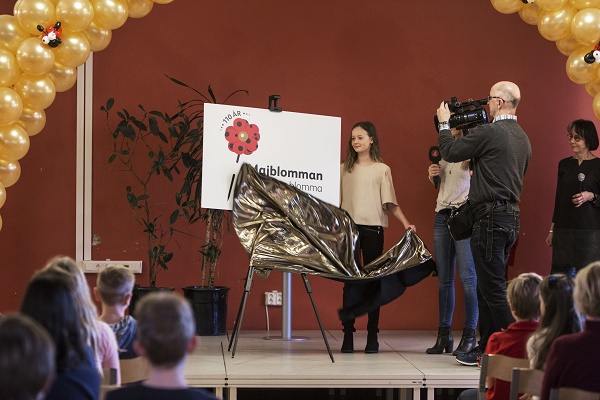 Miranda Nilsson avtäcker årets majblomma, som hon har kommit på mönstret till. Foto: Alma Westlund/majblomman.