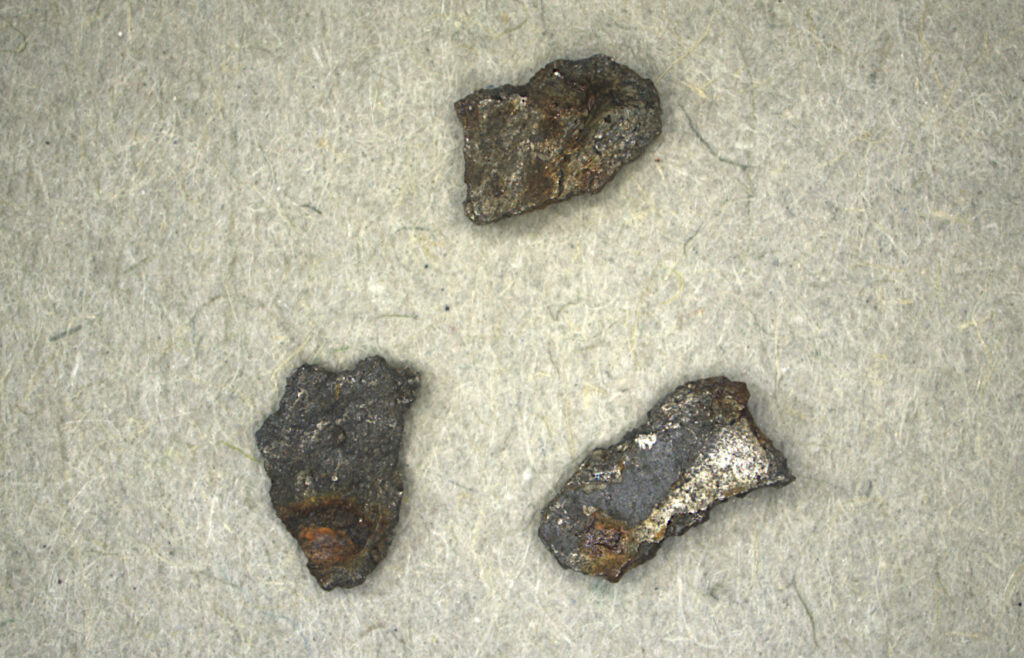 Några små fragment av mörkt färgad meteoritskorpa har hittats. Foto: Naturhistoriska riksmuseet.