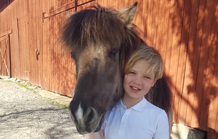 – Han heter Trúr Frá Låeøen och är tolv år som jag. Namnet betyder Trúr som kommer från orten Låeøen. Vi åkte till Norrköping och köpte honom. Det finns hemsidor där man lägger upp hästar som är till salu, ungefär som Blocket, fast med hästar. Vi hade tittat på fem, sex hästar innan, men när jag träffade Trúr kändes det helt rätt.