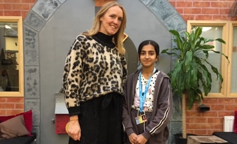 Maria Ramsden från Majblomman tillsammans med minireportern Haima Ehtisham. Foto: Rosengårdsbladet