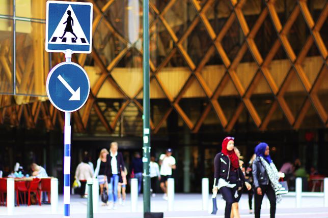 Nu finns det två skyltar som visar var vi ska gå över vägen. En skylt med en man och en skylt med en kvinna. Det är en del av arbetet för jämställdheten i Sverige.