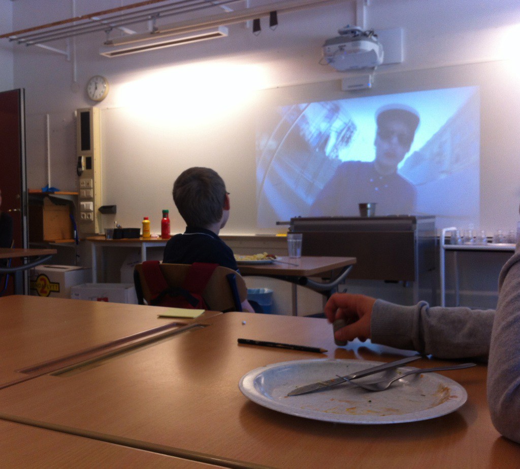 Eleverna får ut maten med en stor metallvagn som de hämtar själva i köket. Maten är i byttor över varmt vatten. Eleverna har även en diskvagn som de hämtar utanför klassrummen och kör in.