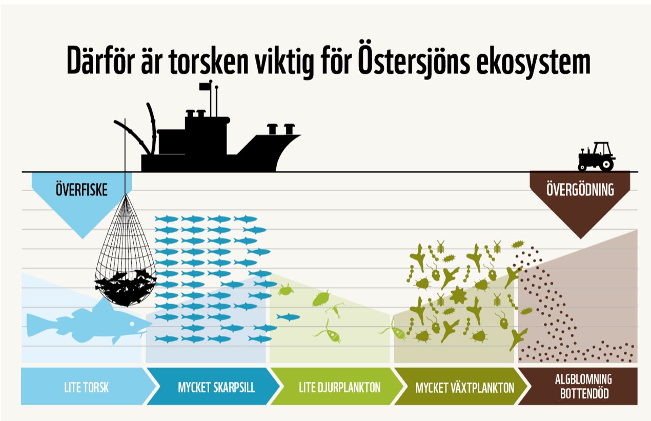 Östersjön påverkas av flera olika miljöskador. Eftersom Östersjön är omringat av så många länder är det mycket gifter som rinner ut i vattnet. Jordbruket släpper ut ämnen som fosfor och kväve vilket påverkar havets ekosystem. Ämnena gör att vissa arter inte kan anpassa sig. Det kan också göra att andra mer lättanpassade arter växer mer och tar över. Överfiske är också ett problem. Torsken är viktig för Östersjöns ekosystem, och om människor fiskar för mycket torsk från Östersjön sker en kedjereaktion som gör att det växer för mycket alger.