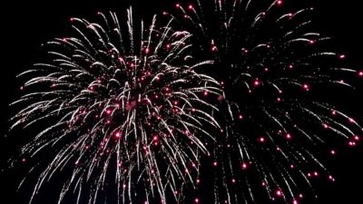 Fyrverkerier lyser upp en mörk himmel.
